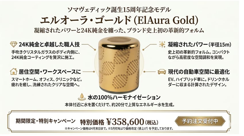 ソマヴェディック誕生から15年。この記念すべき節目に、これまでの常識を覆す次世代モデル「エルオーラ・ゴールド」を発表!
